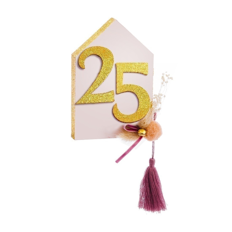 Χριστουγεννιάτικο ξύλινο διακοσμητικό σπιτάκι σε ροζ απόχρωση διακοσμημένο με ξύλινα ζωγραφιστά νούμερα σε χρυσό χρώμα και μπουκέτο από αποξηραμένα λουλούδια.