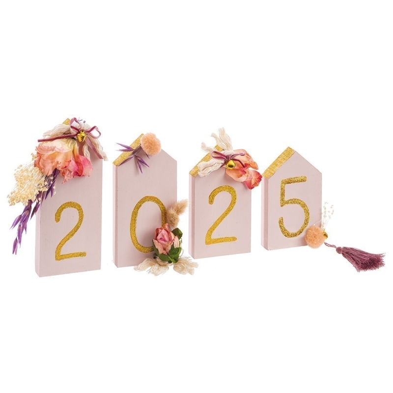 Χριστουγεννιάτικη ξύλινη ζωγραφιστή σύνθεση σε ροζ χρώμα. Περιλαμβάνει 4 σπιτάκια σε διαφορετικές διαστάσεις, ζωγραφιστά με χρυσές glitter αποχρώσεις και διακοσμημένα με μπουκέτο από αποξηραμένα-υφασμάτινα λουλούδια.