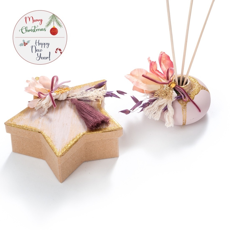 Χριστουγεννιάτικο σετ δώρου που περιλαμβάνει: α)πορσελάνινο βαζάκι σε ροζ,χρυσές αποχρώσεις και στολισμένο με μπουκέτο από υφασμάτινα λουλούδια και μεταλλικό μοτίφ "ΥΓΕΙΑ,ΑΓΑΠΗ,ΕΛΠΙΔΑ" και β) χάρτινο κουτί σε σχήμα αστεριού με χρυσά σβησίματα.