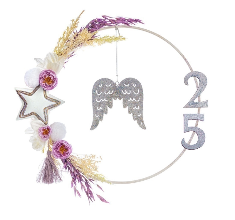 Χριστουγεννιάτικο ξύλινο στεφάνι διακοσμημένο: α) σύνθεση από αποξηραμένα-υφασμάτινα λουλούδια σε λευκές, λιλά και ivory αποχρώσεις, β)μεταλλικά ασημί φτερά και μεταλλικό λευκό αστέρι και γ) ξύλινα νούμερα.