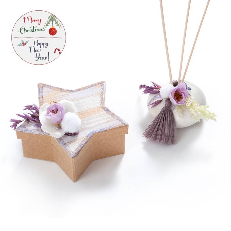 Χριστουγεννιάτικο σετ δώρου που περιλαμβάνει: α)πορσελάνινο βαζάκι σε λευκές-λιλά glitter αποχρώσεις και στολισμένο με μπουκέτο από υφασμάτινα λουλούδια και μεταλλικό μοτίφ και β) χάρτινο κουτί σε σχήμα αστεριού με λιλά glitter σβησίματα.