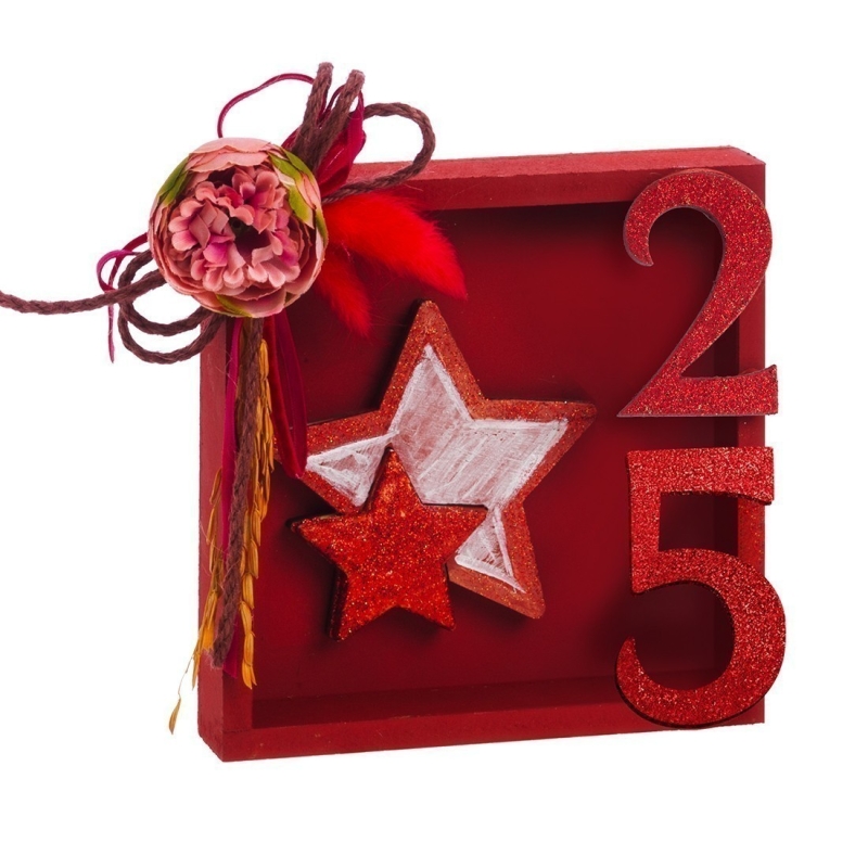 Χριστουγεννιάτικο ξύλινο διακοσμητικό τετράγωνο καδράκι σε μπορντό χρώμα. Το καδράκι στο εσωτερικό είναι διακοσμημένο με κόκκινο glitter αστέρι και στο εξωτερικό με σύνθεση από αποξηραμένα-υφασμάτινα λουλούδια.