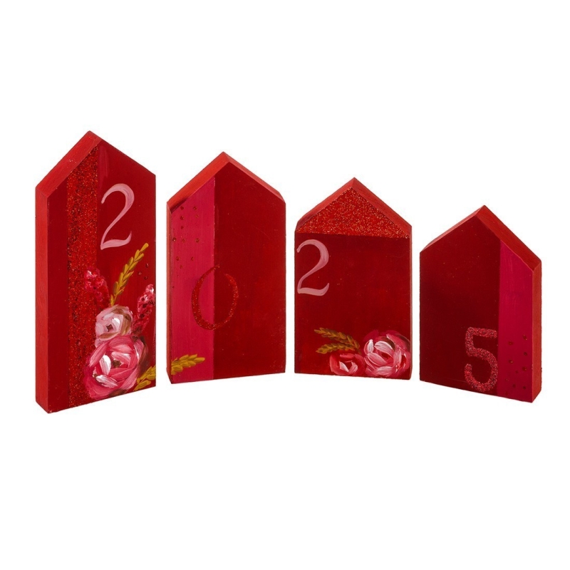 Χριστουγεννιάτικη ξύλινη ζωγραφιστή σύνθεση σε μπορντό χρώμα με κόκκινο glitter. Περιλαμβάνει 4 σπιτάκια σε διαφορετικές διαστάσεις, ζωγραφιστά με λεπτομέρειες από λουλούδια.