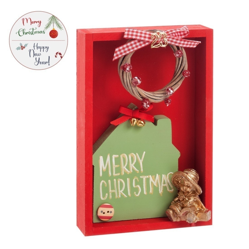 Ξύλινο χριστουγεννιάτικο παραλληλόγραμμο καδράκι σε κόκκινο χρώμα. Το καδράκι είναι διακοσμημένο με ξύλινο κυπαρισσί σπιτάκι που αναγράφει την ευχή "Merry Christmas" και φιγούρα-παιδάκι σε χρυσό χρώμα.