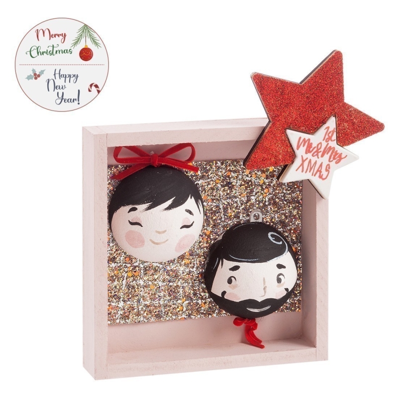 Ξύλινο χριστουγεννιάτικο τετράγωνο καδράκι με θέμα "1st Mr & Mrs Xmas". Το φόντο είναι στολισμένο με μεταλλιζέ ύφασμα. Το καδράκι είναι διακοσμημένο με τα πρόσωπα των Mr & Mrs. Τη σύνθεση ολοκληρώνει ξύλινο αστέρι με κόκκινο glitter.
