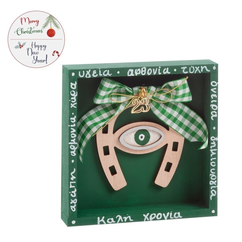 Ξύλινο χριστουγεννιάτικο τετράγωνο καδράκι σε πράσινο χρώμα. Το φόντο είναι στολισμένο με ξύλινο πέταλο-μάτι. Τη σύνθεση ολοκληρώνουν οι ευχές που είναι γραμμένες περιμετρικά στο καδράκι.