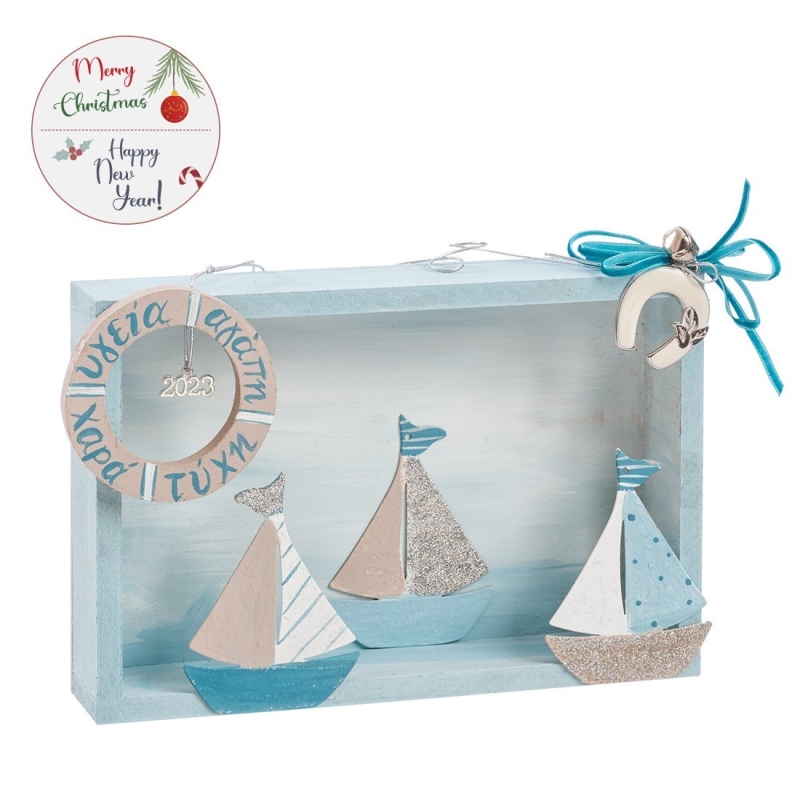 Ξύλινο χριστουγεννιάτικο παραλληλόγραμμο καδράκι σε σιελ χρώμα. Το καδράκι είναι στολισμένο με μεταλλικά καραβάκια σε μπλε,γκρι και ασημί glitter αποχρώσεις.