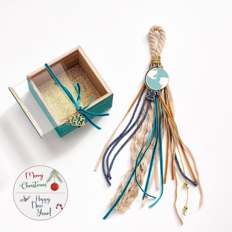 Χριστουγεννιάτικο ξύλινο τετράγωνο κουτάκι με καπάκι plexi glass σε πράσινο χρώμα. Το δωράκι περιλαμβάνει κρεμαστό γούρι στολισμένο με βελούδινο κορδόνι & μεταλλικό μοτίφ υδρόγειο.