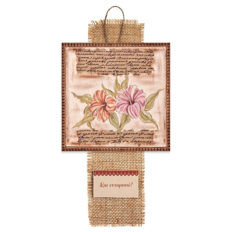 Ξύλινο διακοσμητικό καδράκι κρεμαστό με λινάτσα ,print με παράσταση λουλούδια και καρτελάκι με τη φράση "Σας ευχαριστώ!" σε απόχρωση καφέ.