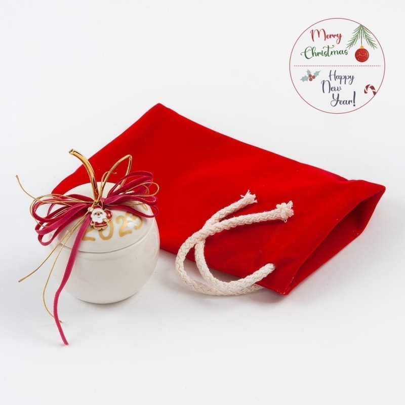 Χριστουγεννιάτικο γούρι πορσελάνινη λευκή μπιζουτιέρα σε σχήμα μήλου. Είναι ζωγραφιστή με ευχές ,διακοσμημένη με μεταλλικό μοτιφ Άγιο Βασίλη και κορδέλες. Συνοδεύεται από βελούδινο πουγκί.