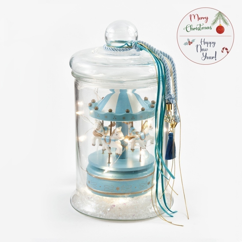 Χριστουγεννιάτικη γυάλα με φωτάκια led. Περιλαμβάνει ξύλινο μουσικό καρουζέλ σε σιελ χρώμα και διακοσμητικό χιόνι. Το καπάκι είναι στολισμένο με κορδόνι rayon . Τα φωτάκια λειτουργούν με μπαταρίες (3 τεμάχια ΑΑ).