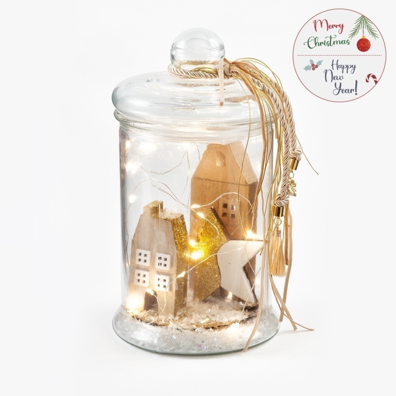 Χριστουγεννιάτικη γυάλα με φωτάκια led. Περιλαμβάνει ξύλινα σπιτάκια και αστέρι με χρυσό glitter σε χιονισμένο τοπίο. Το καπάκι είναι στολισμένο με κορδόνια. Τα φωτάκια λειτουργούν με μπαταρίες (3 τεμάχια ΑΑ).