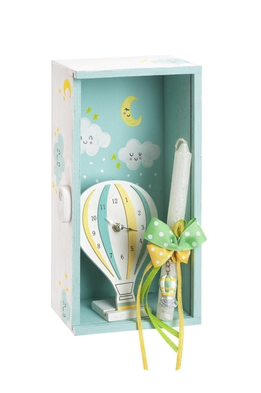 Πασχαλινό σετ δώρου με θέμα το αερόστατο . Το πασχαλινό δωράκι περιλαμβάνει: 1) το ξύλινο κουτί με plexiglass ζωγραφισμένο με συννεφάκια και το φεγγάρι 2) τη λαμπάδα η οποία είναι διακοσμημένη με μεταλλικό μπρελόκ αερόστατο 3) ξύλινο ρολόι αερόστατο .