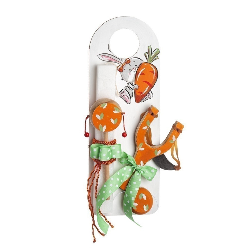 Πασχαλινή λαμπάδα με θέμα κουνελάκι . Το πασχαλινό δωράκι περιλαμβάνει: 1) το ξύλινο διακοσμητικό πόρτας ζωγραφισμένο με κουνελάκι 2) ξύλινη σφεντόνα και γιο γιο ζωγραφιστά 3) τη λαμπάδα διακοσμημένη με ξύλινο ζωγραφιστό τυμπανάκι.