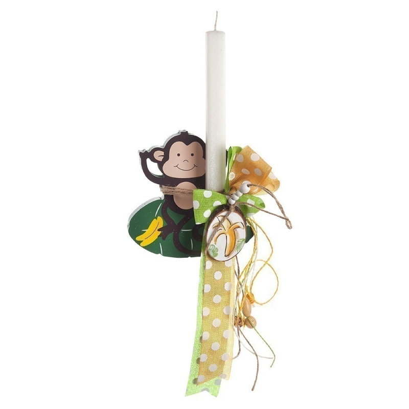 Πασχαλινή λαμπάδα με θέμα την μαϊμού. Το πασχαλινό δωράκι περιλαμβάνει λαμπάδα διακοσμημένη με ξύλινο κορμό και ξύλινη διακοσμητική μαϊμού