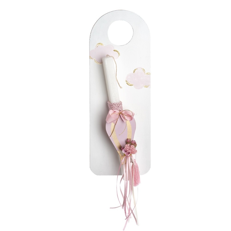 Πασχαλινή λαμπάδα με θέμα το αερόστατο .Το πασχαλινό δωράκι περιλαμβάνει: 1) το ξύλινο διακοσμητικό πόρτας ζωγραφισμένο 2) τη λαμπάδα διακοσμημένη με μεταλλικό ροζ -χρυσό μοτιφ αερόστατο και λουλούδια .