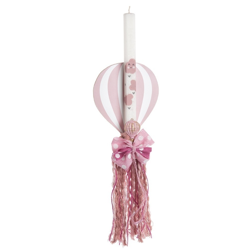 Πασχαλινή λαμπάδα με θέμα το αερόστατο .Το πασχαλινό δωράκι περιλαμβάνει τη ζωγραφιστή λαμπάδα διακοσμημένη με ξύλινη παράσταση ροζ αερόστατο .