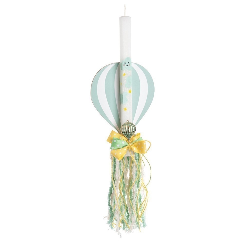 Πασχαλινή λαμπάδα με θέμα το αερόστατο .Το πασχαλινό δωράκι περιλαμβάνει τη ζωγραφιστή λαμπάδα διακοσμημένη με ξύλινη παράσταση βεραμάν αερόστατο.