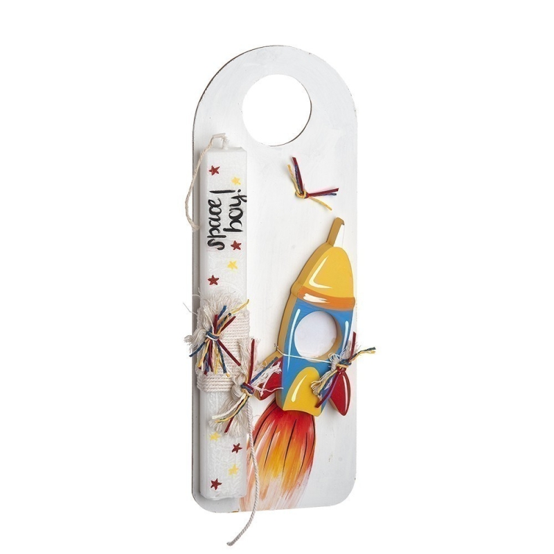 Πασχαλινή λαμπάδα με θέμα το διάστημα . Το πασχαλινό δωράκι περιλαμβάνει: 1) το ξύλινο διακοσμητικό πόρτας 2) τη λαμπάδα ζωγραφισμένη και διακοσμημένη με ξύλινη κορνίζα πύραυλος.