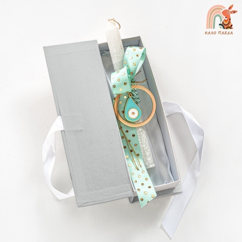 Το πασχαλινό δωράκι περιλαμβάνει: χάρτινο κουτάκι ασημί ζωγραφιστό με επένδυση σατέν και τη λαμπάδα διακοσμημένη με χρυσό μεταλλικό κρεμαστό δάκρυ ματάκι σε στρογγυλό πλαίσιο .