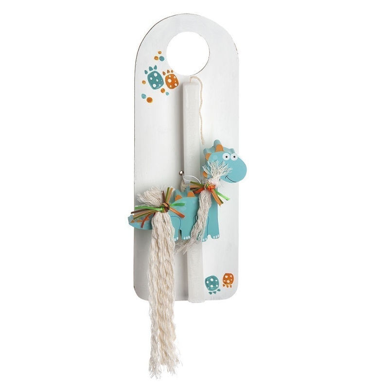 Πασχαλινή λαμπάδα με θέμα τον δεινόσαυρο . Το πασχαλινό δωράκι περιλαμβάνει: 1) το ξύλινο διακοσμητικό πόρτας ζωγραφισμένο2) τη λαμπάδα διακοσμημένη με ξύλινη βεραμάν κορνίζα δεινόσαυρο.