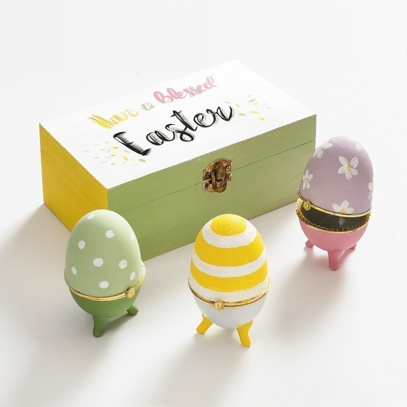 Πασχαλινό σετ δώρου σε ζωγραφιστό κουτί με θέμα "Have a blessed Easter." Στο κουτί περιλαμβάνονται τρία ζωγραφιστά αυγουλάκια σε βεραμάν, κίτρινη και ροζ απόχρωση.