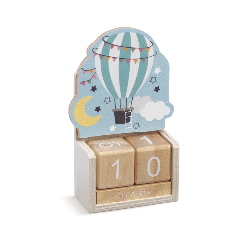 Ξύλινο natural ημερολόγιο με δυνατότητα αλλαγής της ημερομηνίας προσαρμόζοντας τα κυβάκια. Είναι διακοσμημένο με ξύλινη παράσταση print αερόστατο σιέλ.