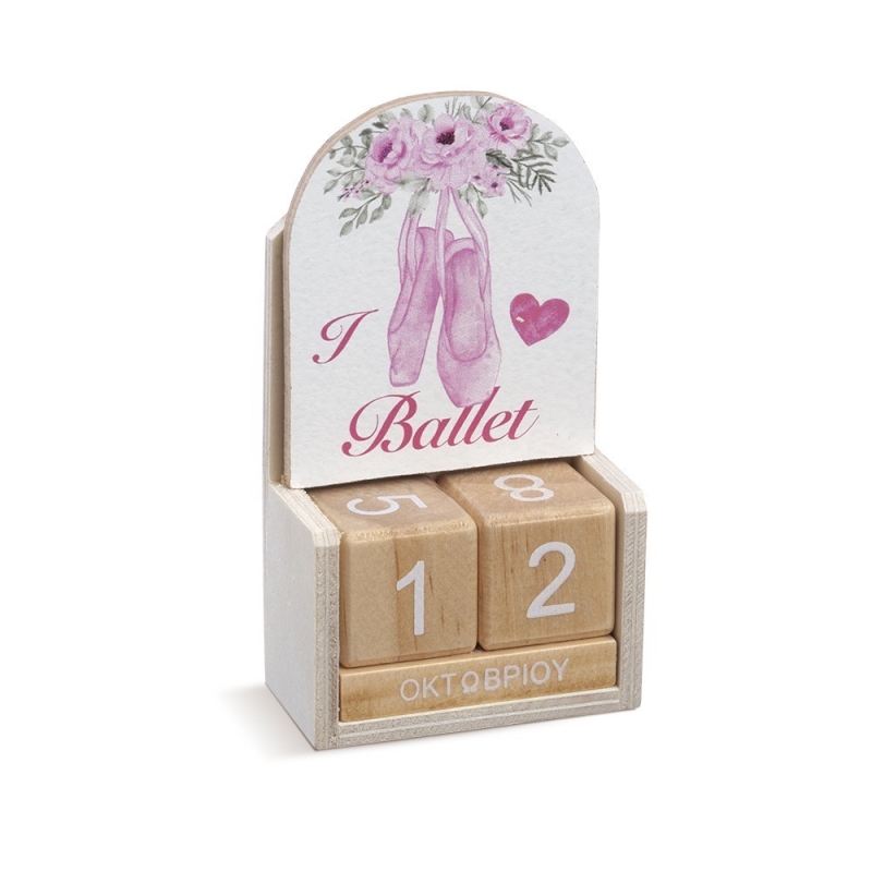 Ξύλινο natural ημερολόγιο με δυνατότητα αλλαγής της ημερομηνίας προσαρμόζοντας τα κυβάκια. Είναι διακοσμημένο με ξύλινη παράσταση print πουέντ μπαλαρίνας σε ροζ απόχρωση.