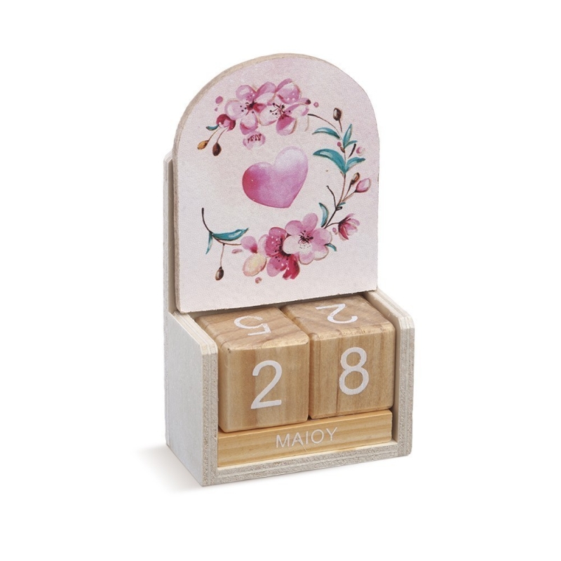 Ξύλινο natural ημερολόγιο με δυνατότητα αλλαγής της ημερομηνίας προσαρμόζοντας τα κυβάκια. Είναι διακοσμημένο με ξύλινη παράσταση print καρδιά με λουλούδια.