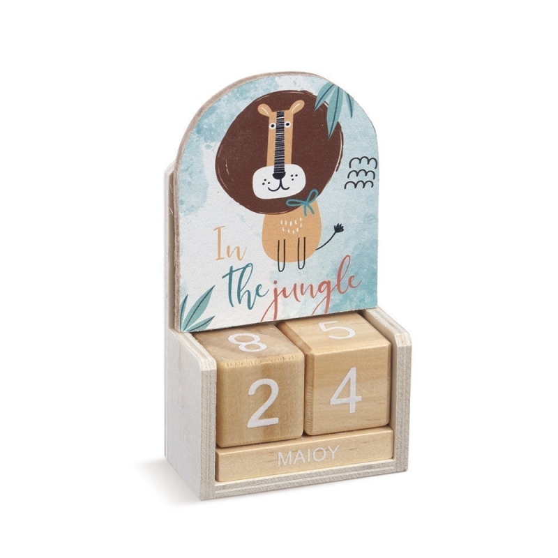 Ξύλινο natural ημερολόγιο με δυνατότητα αλλαγής της ημερομηνίας προσαρμόζοντας τα κυβάκια. Είναι διακοσμημένο με ξύλινη παράσταση print με ζωάκια της ζούγκλας .