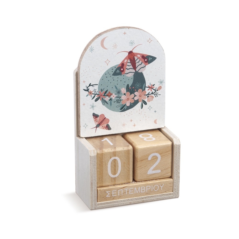 Ξύλινο natural ημερολόγιο με δυνατότητα αλλαγής της ημερομηνίας προσαρμόζοντας τα κυβάκια. Είναι διακοσμημένο με ξύλινη παράσταση print με πεταλούδες .