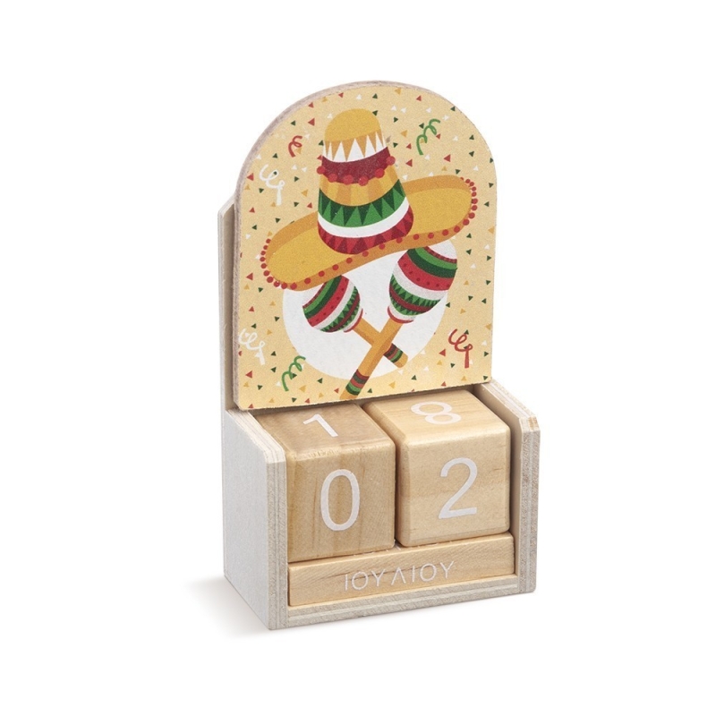 Ξύλινο natural ημερολόγιο με δυνατότητα αλλαγής της ημερομηνίας προσαρμόζοντας τα κυβάκια. Είναι διακοσμημένο με ξύλινη παράσταση print μεξικάνικη Fiesta.