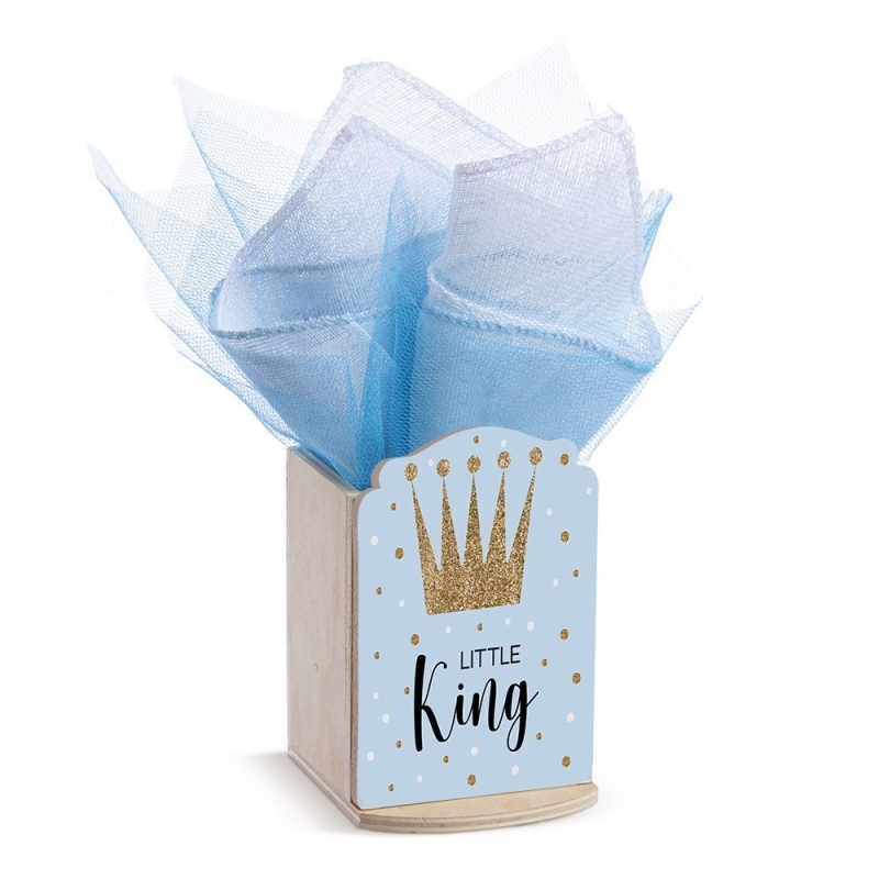 Ξύλινη μολυβοθήκη σε natural χρώμα. Διακοσμημένο με κοπτικό little king σε σιέλ απόχρωση.
