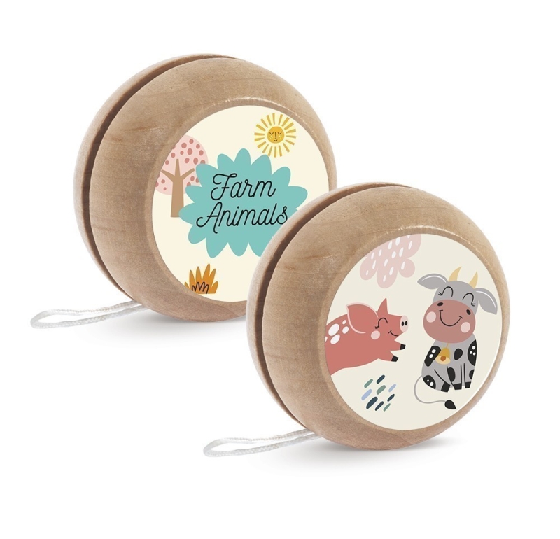 Ξύλινο natural γιο-γιο με σκοινάκι. Είναι διακοσμημένο με αυτοκόλλητο print ζωάκια της φάρμας με διαφορετικό σχέδιο μπρος-πίσω. Τα yo-yo έχουν αυτοκόλλητο και στις 2 όψεις.