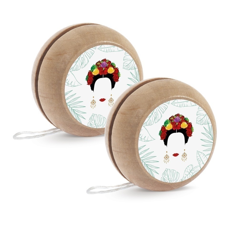Ξύλινο natural γιο-γιο με σκοινάκι. Είναι διακοσμημένο με αυτοκόλλητο print Frida Kahlo με διαφορετικό σχέδιο μπρος-πίσω. Τα yo-yo έχουν αυτοκόλλητο και στις 2 όψεις.