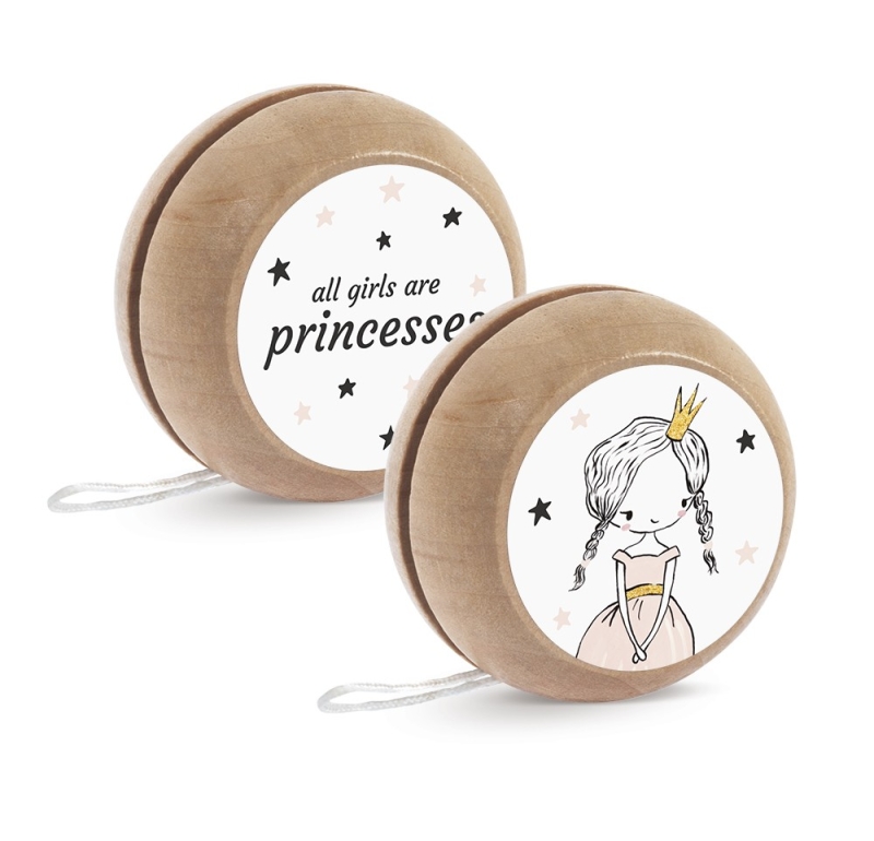 Ξύλινο natural γιο-γιο με σκοινάκι. Είναι διακοσμημένο με αυτοκόλλητο print πριγκίπισσα με διαφορετικό σχέδιο μπρος-πίσω. Τα yo-yo έχουν αυτοκόλλητο και στις 2 όψεις.