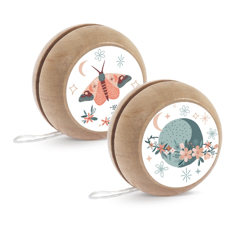 Ξύλινο natural γιο-γιο με σκοινάκι. Είναι διακοσμημένο με αυτοκόλλητο print πεταλούδες με διαφορετικό σχέδιο μπρος-πίσω. Τα yo-yo έχουν αυτοκόλλητο και στις 2 όψεις.