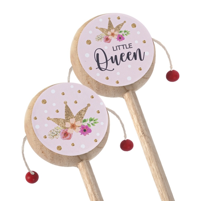 Ξύλινο natural τυμπανάκι με αυτοκόλλητο print little queen σε ροζ απόχρωση με διαφορετικό σχέδιο μπρος-πίσω. Τα τυμπανάκια έχουν αυτοκόλλητο και στις 2 όψεις.