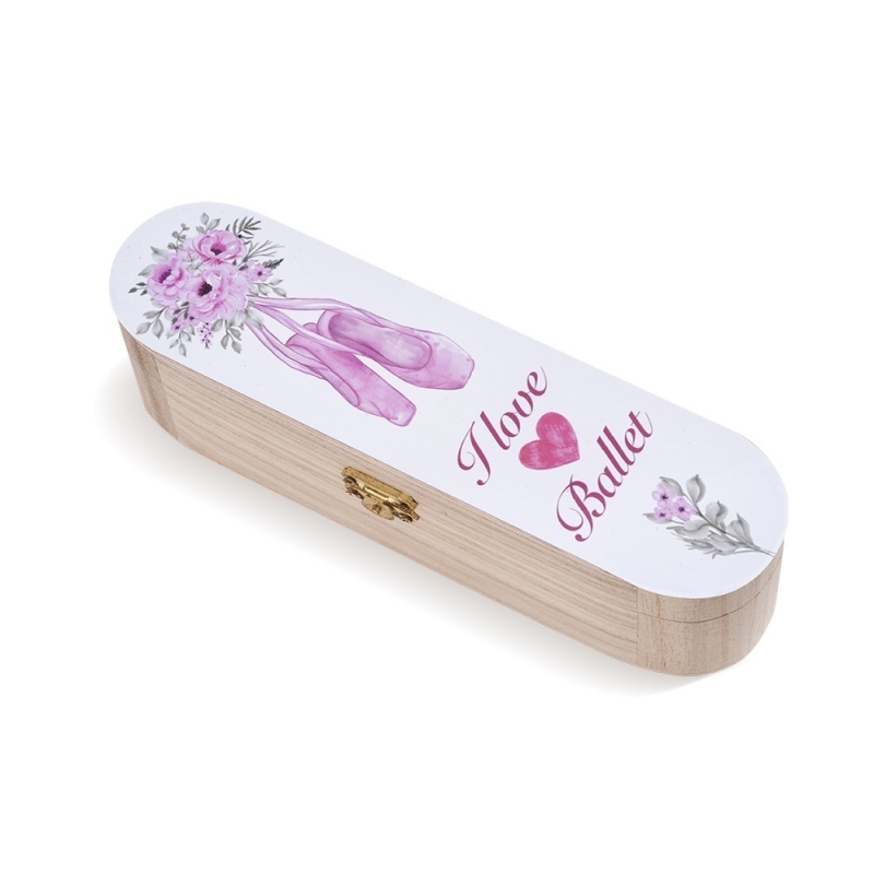 Ξύλινη natural κασετίνα με μεταλλικό κούμπωμα. Είναι διακοσμημένη με αυτοκόλλητο print πουέντ μπαλαρίνας σε ροζ απόχρωση.