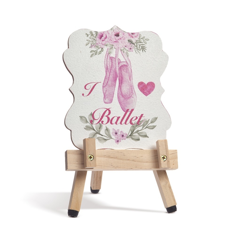 Ξύλινο καδράκι print σε καβαλέτο. Η παράσταση είναι πουέντ μπαλαρίνας σε ροζ απόχρωση.