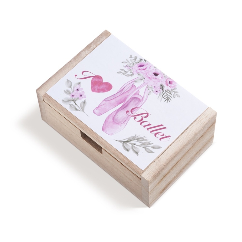Ξύλινο natural παραλληλόγραμμο κουτί. Είναι διακοσμημένο με αυτοκόλλητο print πουέντ μπαλαρίνας.