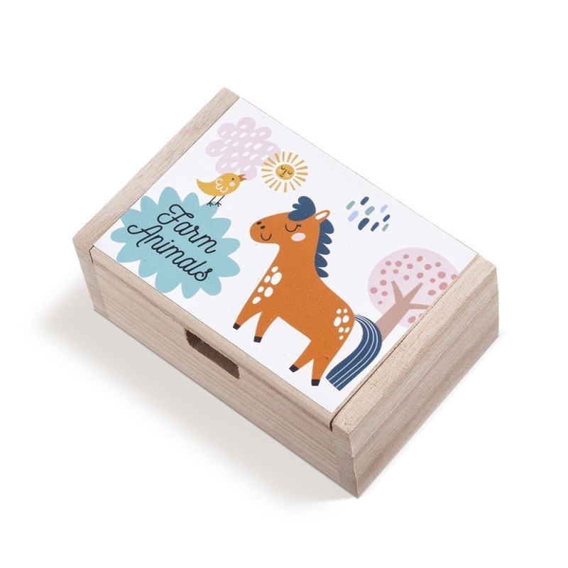 Ξύλινο natural παραλληλόγραμμο κουτί. Είναι διακοσμημένο με αυτοκόλλητο print ζωάκια της φάρμας .