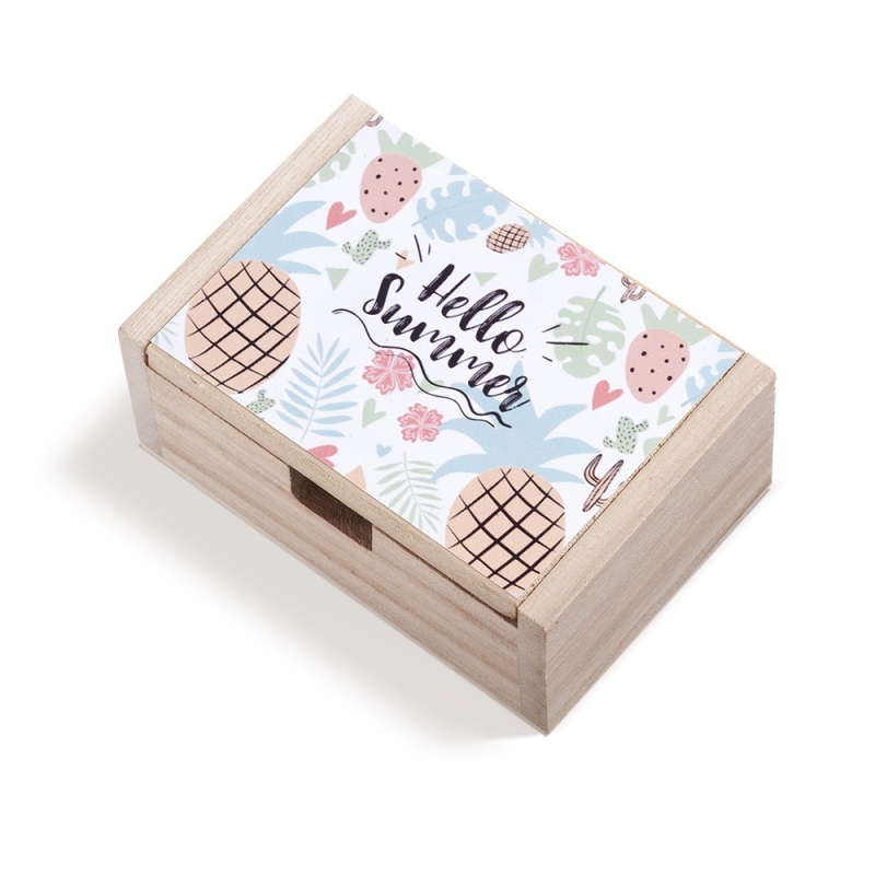 Ξύλινο natural παραλληλόγραμμο κουτί. Είναι διακοσμημένο με αυτοκόλλητο print hello summer με ανανά.