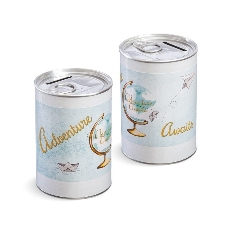 Μεταλλικός κουμπαράς σε σχήμα κονσέρβας. Είναι διακοσμημένο με αυτοκόλλητο print υδρόγειος.