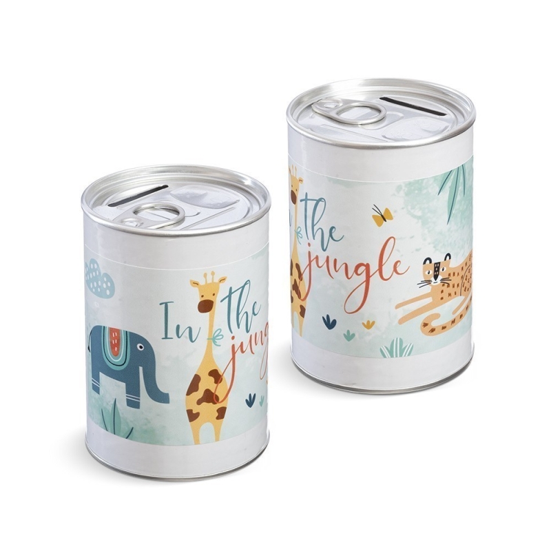 Μεταλλικός κουμπαράς σε σχήμα κονσέρβας. Είναι διακοσμημένο με αυτοκόλλητο print ζωάκια της ζούγκλας.