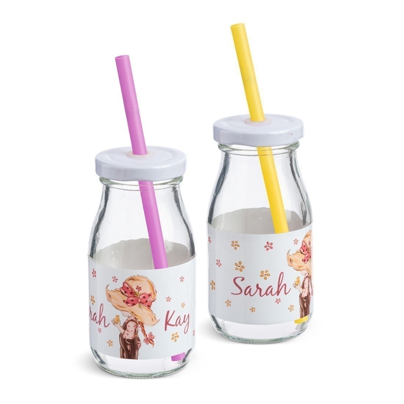 Γυάλινο μπουκάλι γάλακτος 200ml με λευκό μεταλλικό καπάκι. Συνοδεύεται από πολύχρωμα καλαμάκια. Είναι διακοσμημένο με αυτοκόλλητο print Sarah Kay σε φράχτη .