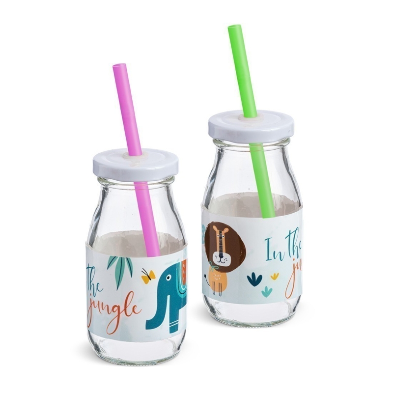 Γυάλινο μπουκάλι γάλακτος 200ml με λευκό μεταλλικό καπάκι. Συνοδεύεται από πολύχρωμα καλαμάκια. Είναι διακοσμημένο με αυτοκόλλητο print ζωάκια της ζούγκλας.