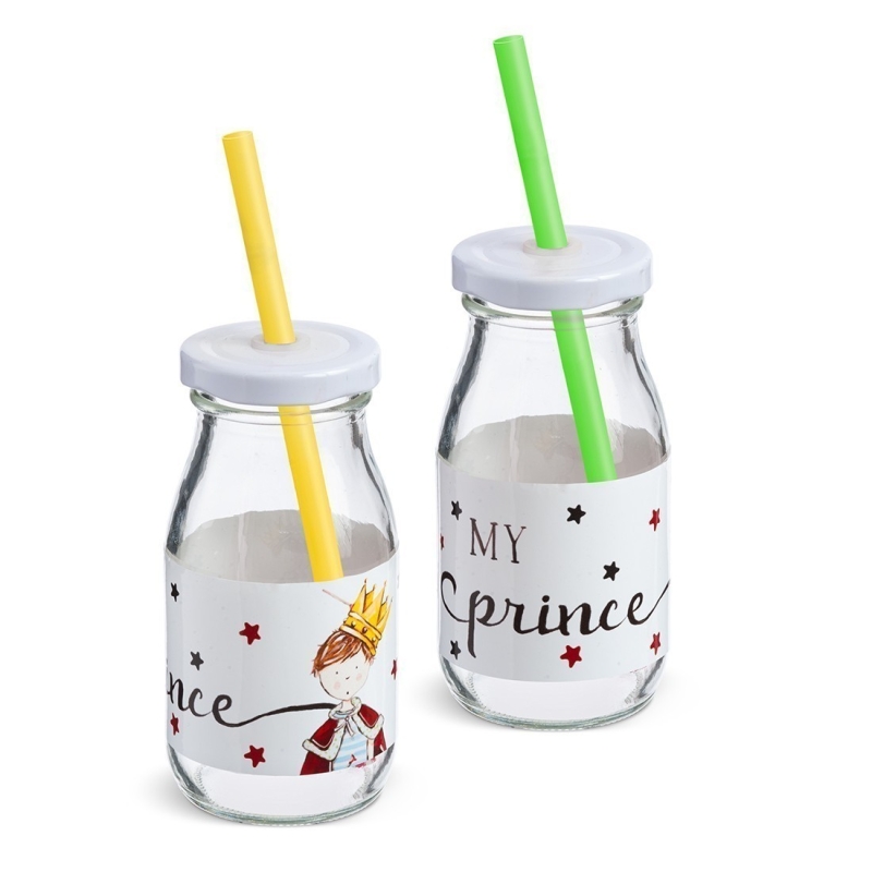 Γυάλινο μπουκάλι γάλακτος 200ml με λευκό μεταλλικό καπάκι. Συνοδεύεται από πολύχρωμα καλαμάκια. Είναι διακοσμημένο με αυτοκόλλητο printMy prince.