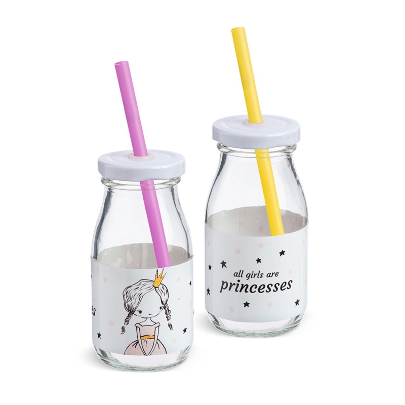 Γυάλινο μπουκάλι γάλακτος 200ml με λευκό μεταλλικό καπάκι. Συνοδεύεται από πολύχρωμα καλαμάκια. Είναι διακοσμημένο με αυτοκόλλητο print πριγκίπισσα.