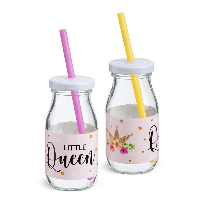 Γυάλινο μπουκάλι γάλακτος 200ml με λευκό μεταλλικό καπάκι. Συνοδεύεται από πολύχρωμα καλαμάκια. Είναι διακοσμημένο με αυτοκόλλητο print little queen σε ροζ απόχρωση.
